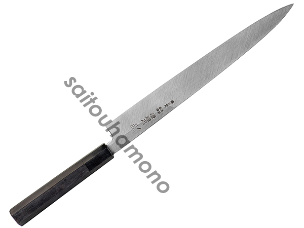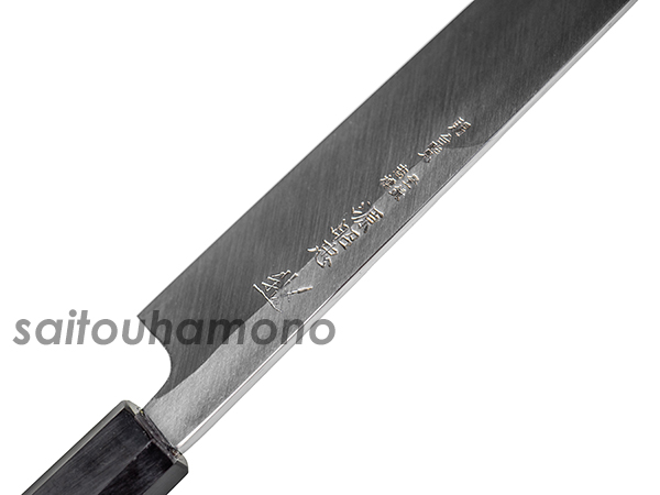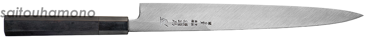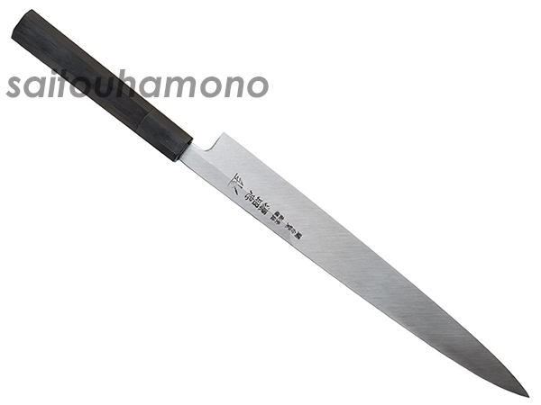 | 柳刃包丁はもともと関西型の刺身包丁ですが、現在では広く全国で使われています。 素材の組織をつぶさぬよう峰薄で刃幅が狭く、刃元から切っ先までを使い引き切ります。 柳刃包丁で引く刺身は角が立ち、切り口に艶があるなど見た目はもちろん味も引き立ちます。 また、刺身以外にも皮引きや料理の切り分け等にも使われます。 一般向けには240〜270ミリ。本職の方には300ミリ前後がよく使われるサイズです。 ※刃渡サイズは柄との境目付近までの長さなので実際の刃渡りは表示よりも短くなります。 |